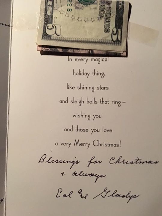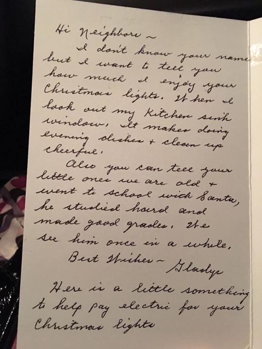 As if the card and note weren’t sweet enough, the woman included a little something to help pay the electric for the Christmas lights. It was signed simply Cal and Gladys.